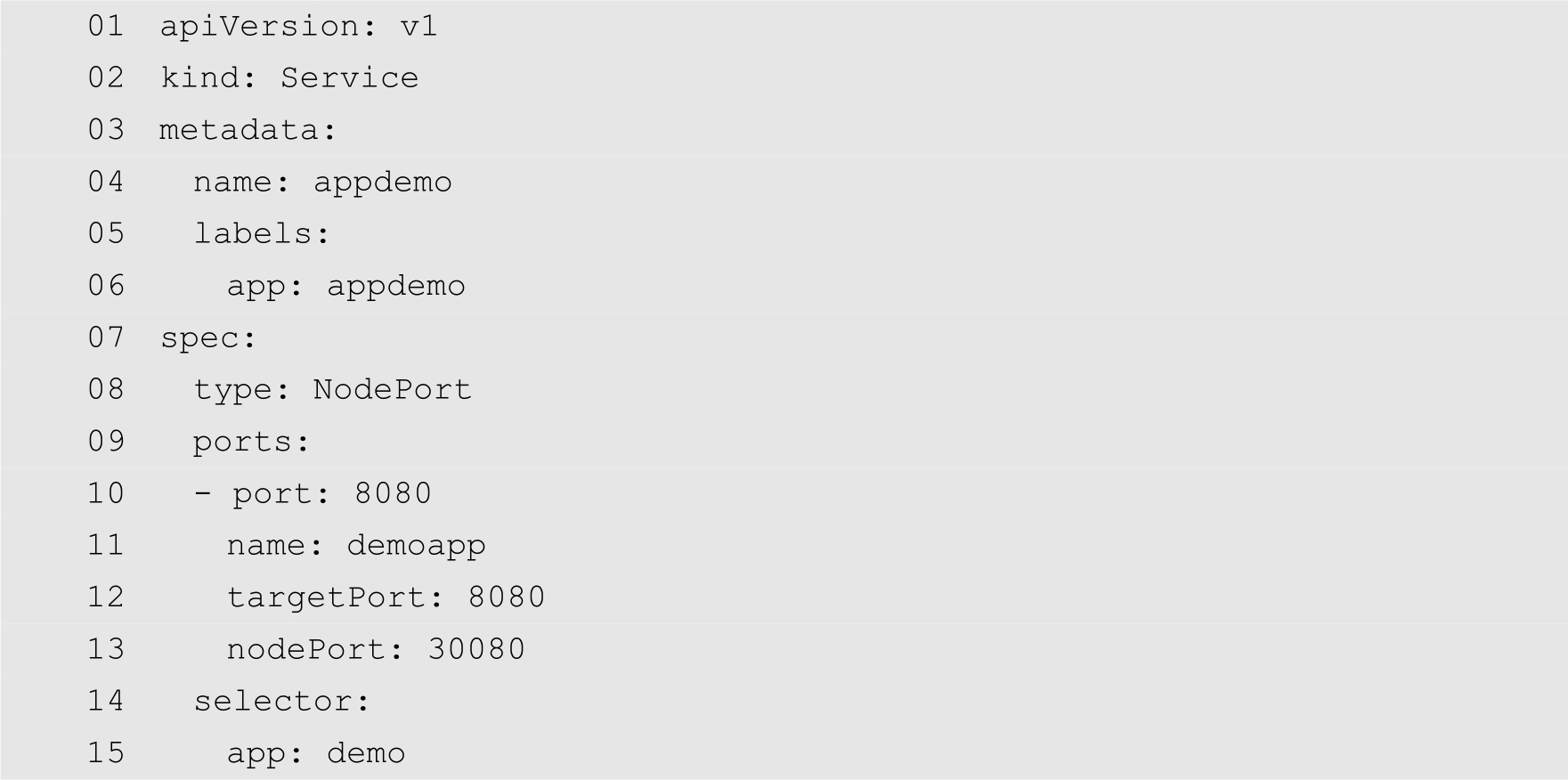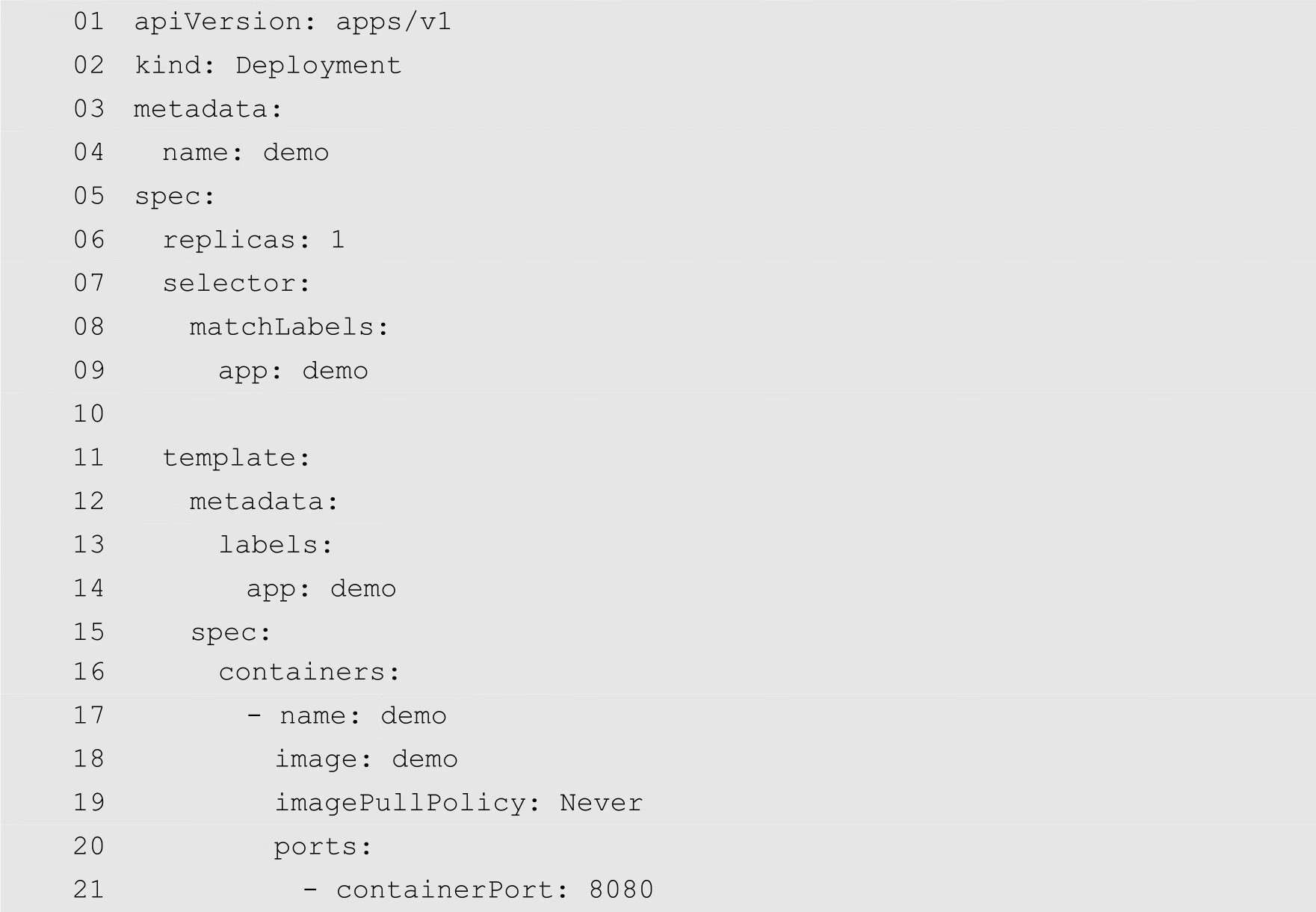 第18行通过image字段指定容器使用的镜像为demo,这个镜像文件是前面构建的。第19行通过imagePullPolicy字段设置不从远程软件仓库拉取镜像。