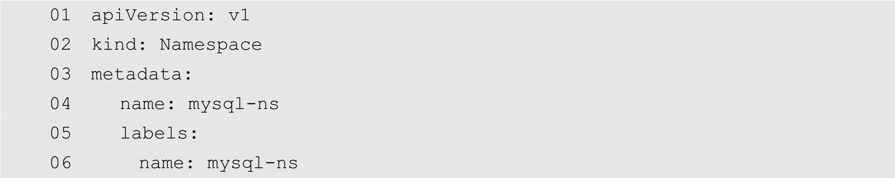 首先为MySQL创建一个单独的命名空间,YAML文件的代码如下: