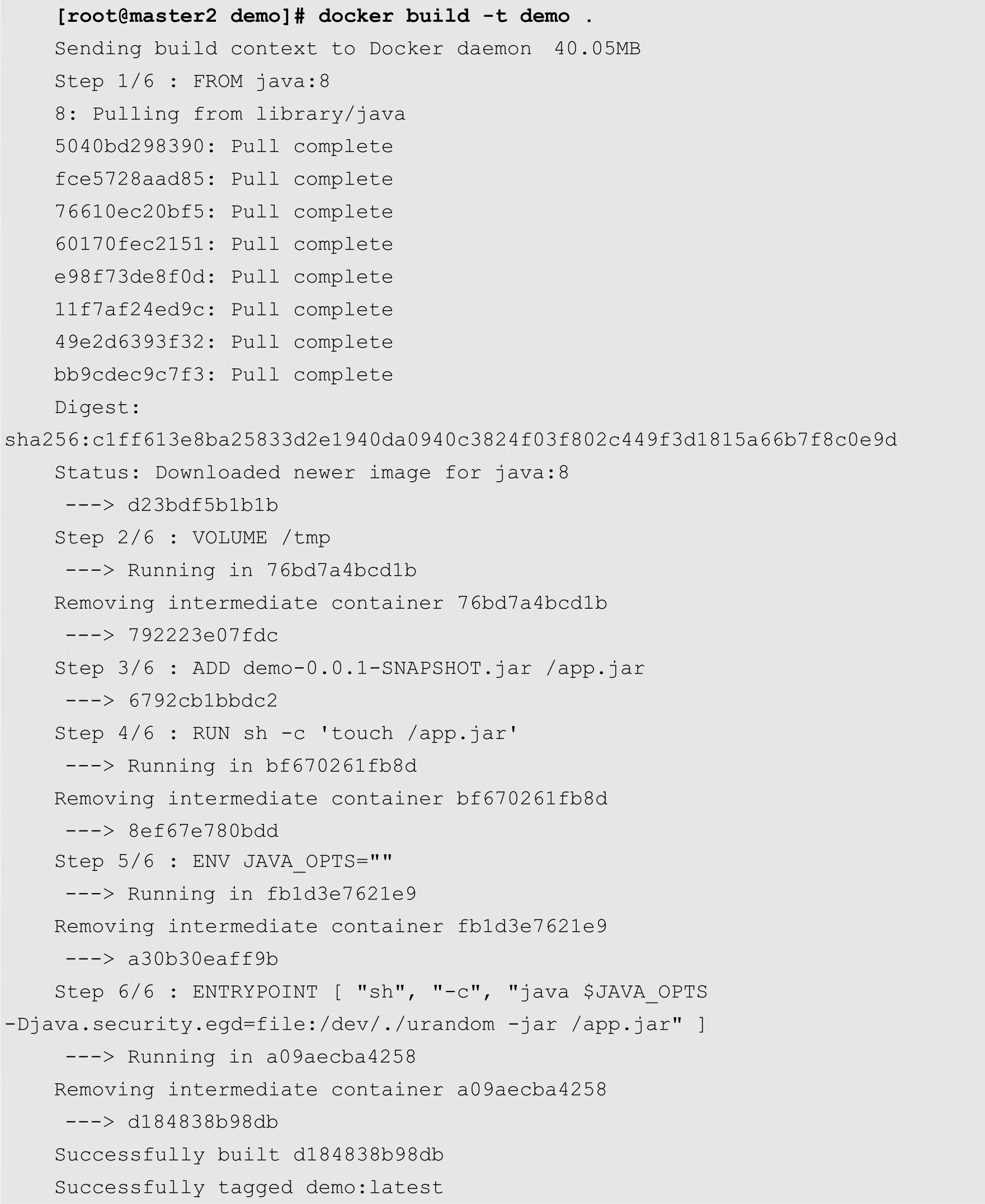 第1行的FROM指令表明该Docker镜像是在java:8这个镜像的基础上构建的。FROM指令的功能是用来指定基础镜像。第2行的VOLUME指令的功能是定义匿名数据卷,在本例中,VOLUME指令指向/tmp。第3行的ADD指令的功能是从上下文目录中复制文件或者目录到容器里指定路径。在本例中是将前面打包生成的demo-0.0.1-SNAPSHOT.jar文件,复制到容器根目录中,并且命名为app.jar。第4行的RUN指令用来执行后面的命令。第5行的ENV指令用来配置环境变量,在本例中不需要额外指定环境变量。第6行的ENTRYPOINT指令用来指定容器启动时需要执行的命令。在本例中,其功能是将前面打包生成的jar文件在容器启动时一起启动。