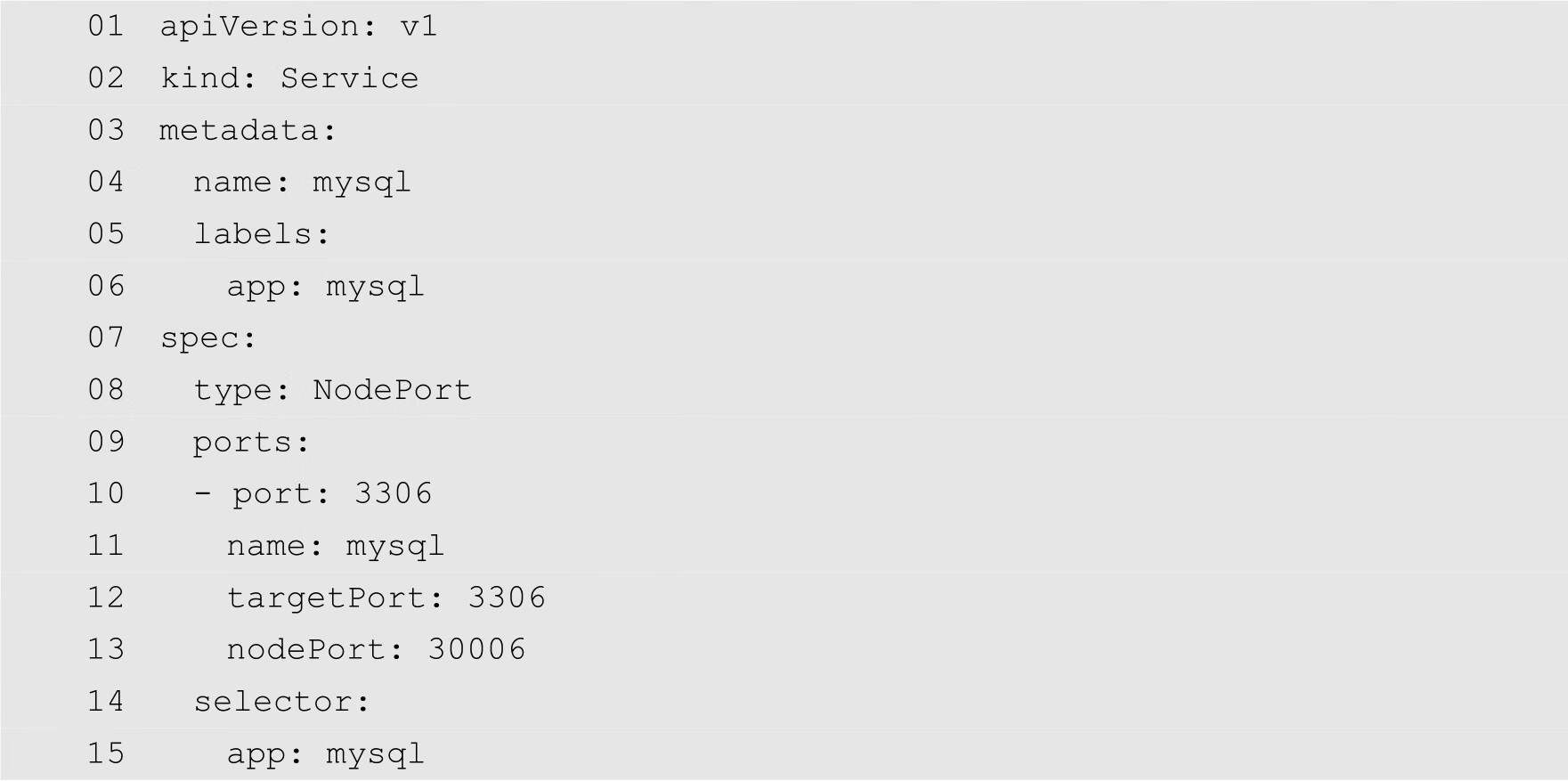 再为MySQL容器创建一个服务,便于外部访问,其YAML代码如下: