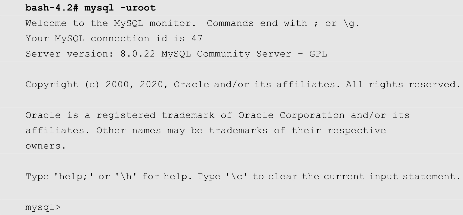 其中391d9c11ce92为容器ID,bash为进入容器内部之后所要执行的命令。执行完成之后,可以发现命令提示符已经发生变化,然后使用mysql命令连接到MySQL服务器,如下所示: