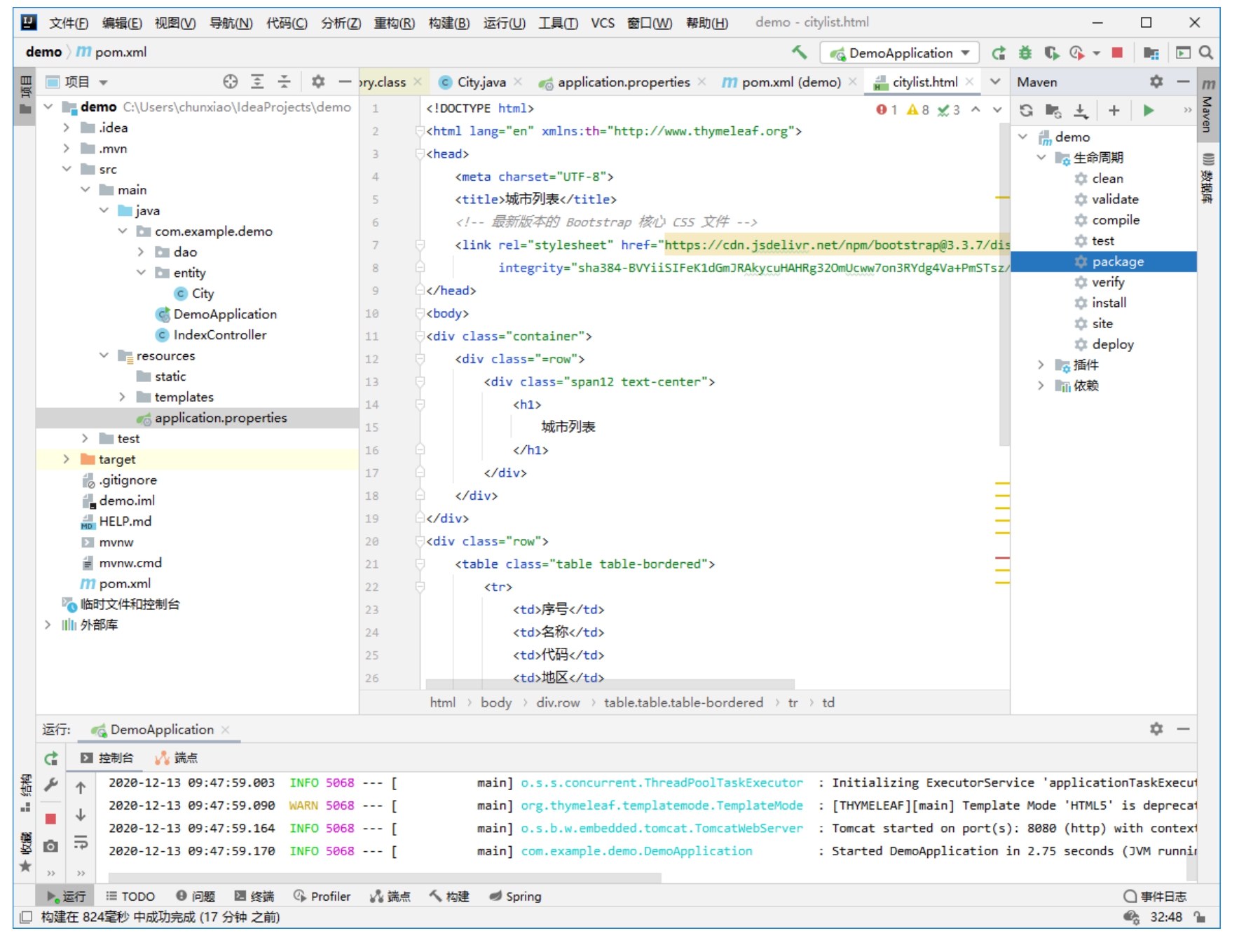 在IntelliJ IDEA的右侧打开Maven面板,双击其中的package命令,在底部的“运行”窗口中会不断输出日志信息,如下所示: