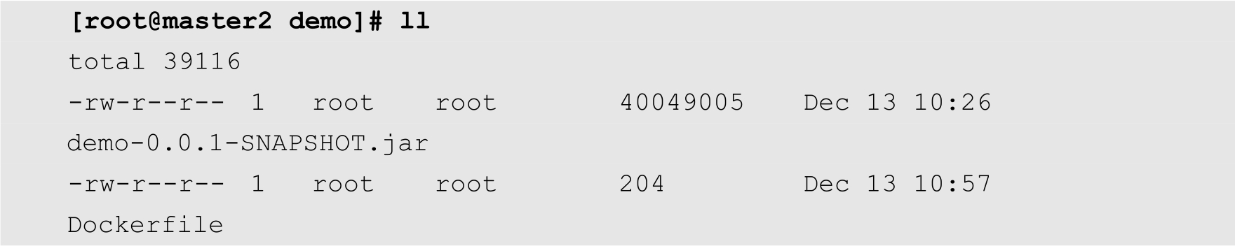 接下来,需要将用户的应用系统构建在一个镜像文件中。创建一个新的目录,把前面生成的demo-0.0.1-SNAPSHOT.jar文件和Docker文件都放在该目录中,注意Docker文件的文件名为Dockerfile。最后目录的内容如下: