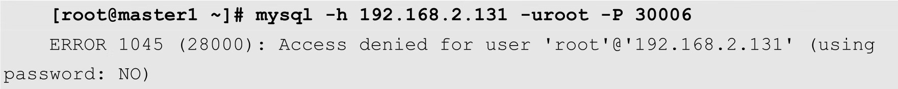 创建完成之后,用户原则上就可以通过MySQL Pod所在的节点的IP地址和nodePort端口访问MySQL服务器了。但是实际上用户连接MySQL服务器时通常会出现以下错误: