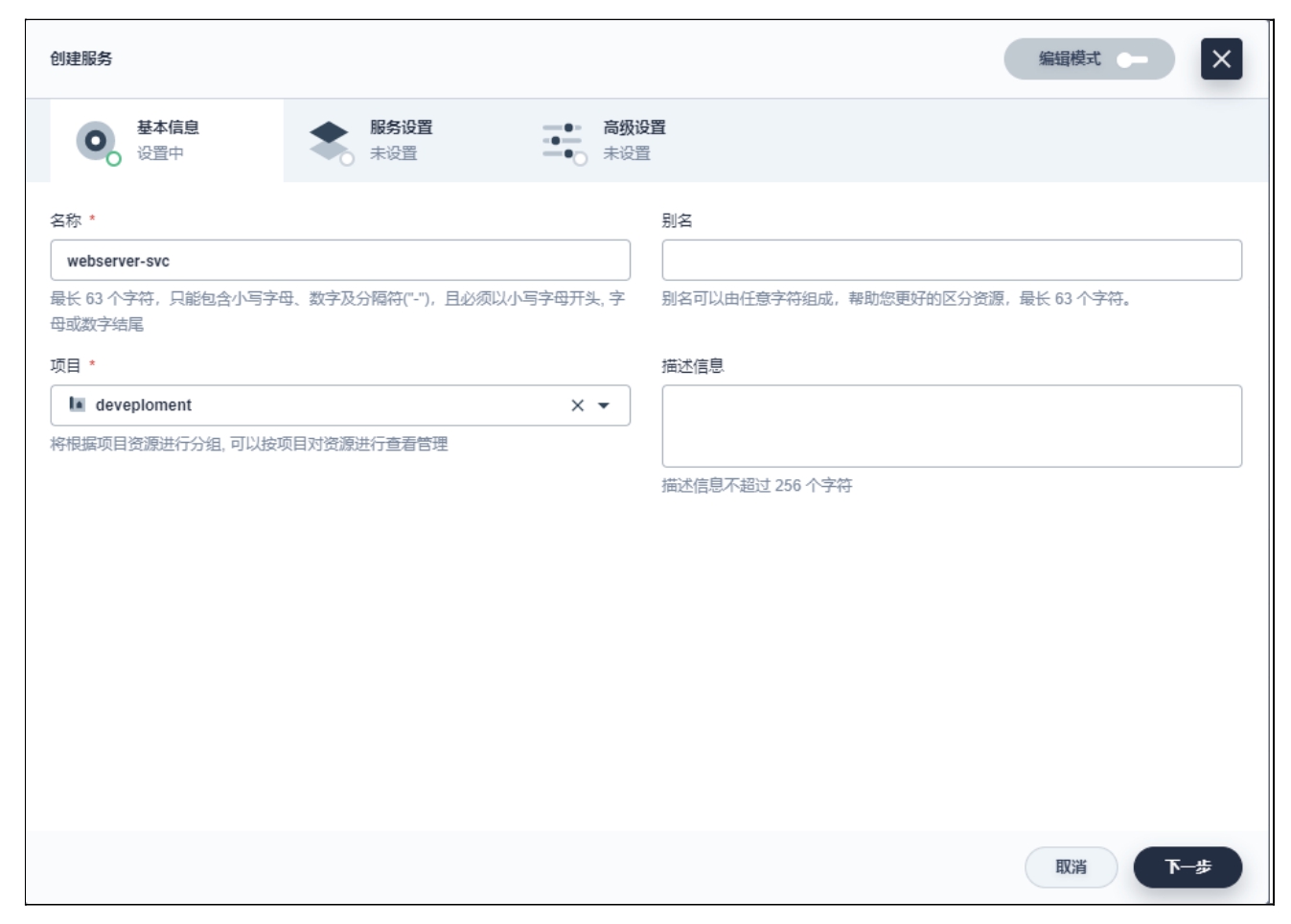 在“名称”文本框中输入服务的名称,例如webserver-svc,在“项目”下拉菜单中选择前面创建的development项目,单击“下一步”按钮进入“服务设置”对话框。