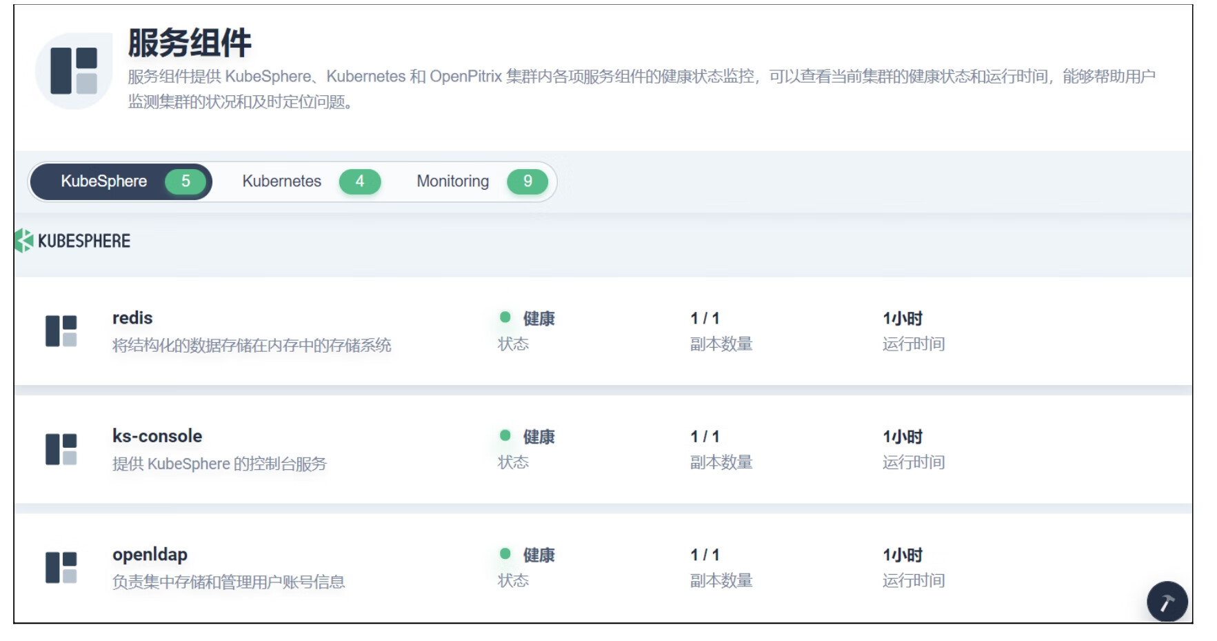 所有的服务组件分为3个部分,其中KubeSphere有5个,Kubeletes有4个,Monitoring有9个。
