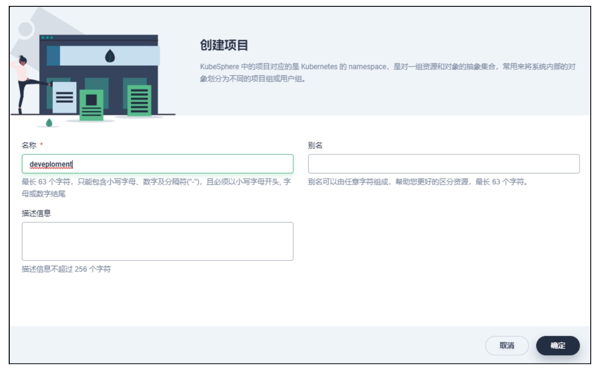 项目分为用户项目和系统项目,其中用户项目为用户自己创建的命名空间,而系统项目则是KubeSphere系统本身的命名空间。点击用户项目页面底部的“创建”按钮,可以创建一个新的项目,如图12-9所示。