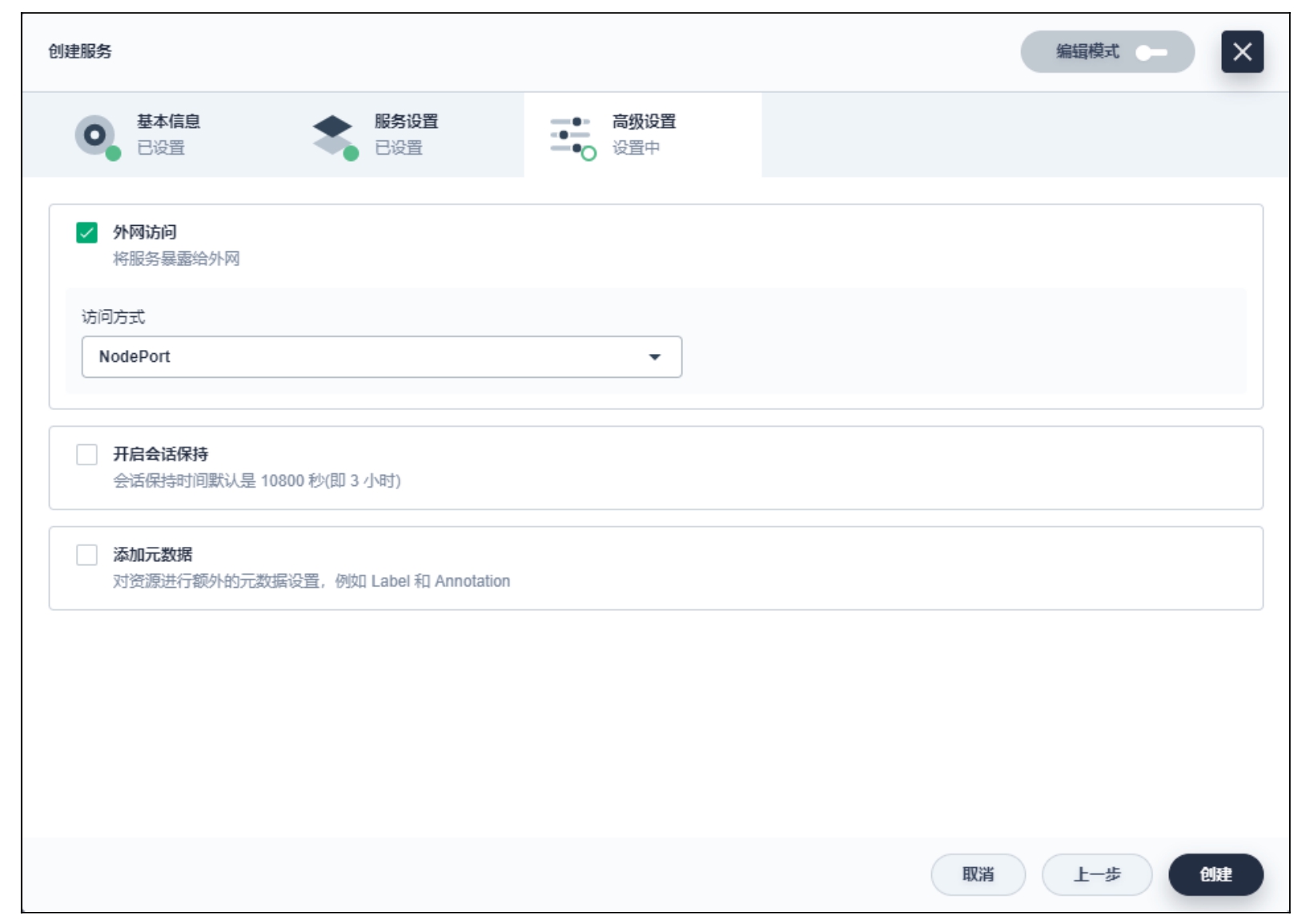 (3)高级设置。在“高级设置”对话框中勾选“外网访问”复选框,然后在“访问方式”下拉菜单中选择NodePort选项,如图12-21所示。
