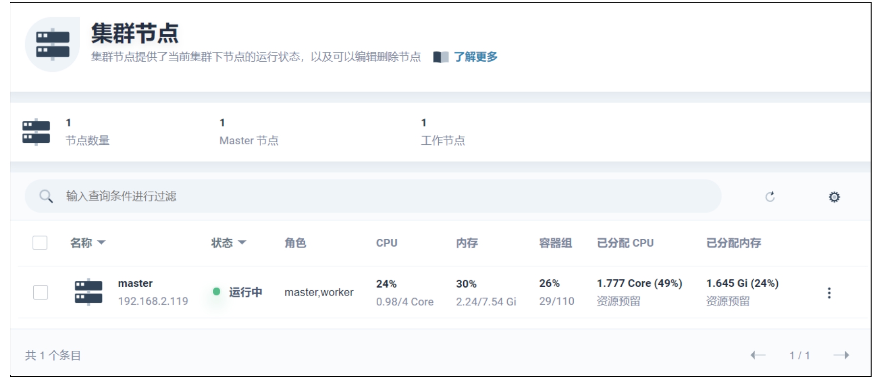 从图12-6可知,当前集群中有1个节点,其中1个Master节点,1个工作节点。下面的节点列表每1行描述了一个节点,点击右侧的