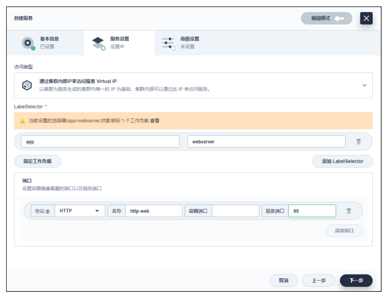 在本例中,服务类型选择“通过集群内部IP来访问服务Virtual IP”选项。在LabelSelector的键文本框中输入app,值文本框中输入webserver,这个标签与前面创建的Nginx应用要一致。“服务端口”文本框中输入前面设置的Nginx对外服务的端口80。最后点击“下一步”按钮。