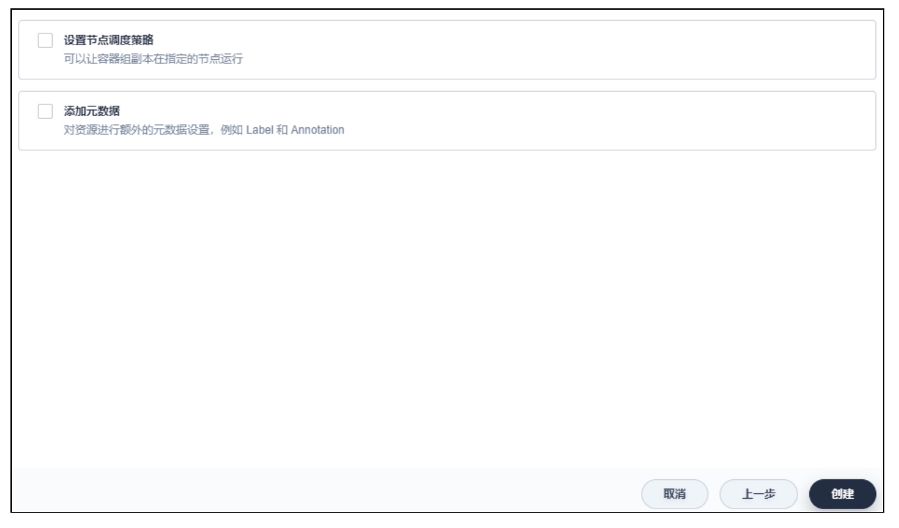 (5)高级设置。在该界面中,用户可以设置节点的调度策略以及标签等元数据,如图12-16所示。如果没有需要,则点击“创建”按钮,完成Nginx应用的部署。
