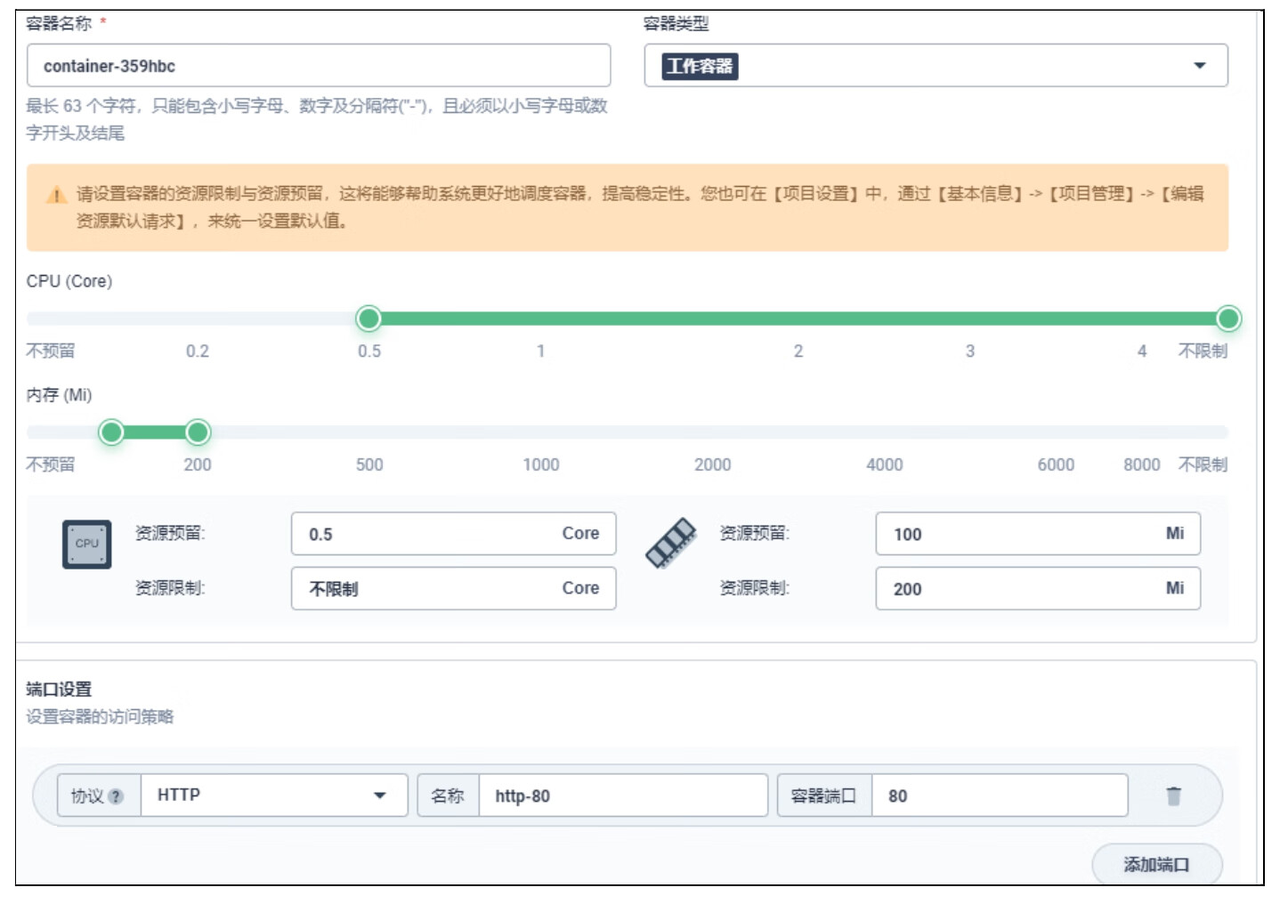 此外,用户还可以进行其他的容器设置,例如容器名称、容器类型、资源限制以及端口设置等,用户可以根据自己的实际情况进行修改,如图12-14所示。