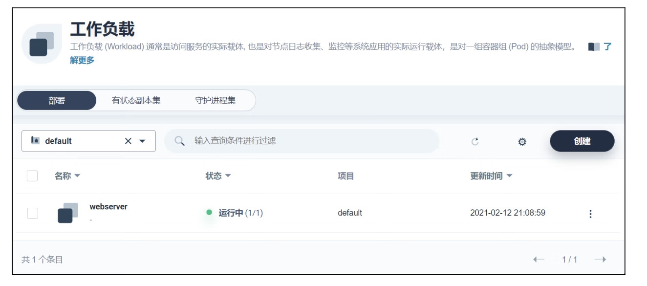 工作负载模块是最重要的模块,在该模块中用户可以管理部署、任务、服务和应用路由等Kubeletes资源。下面演示如何使用KubeSphere控制台创建一个Nginx应用。