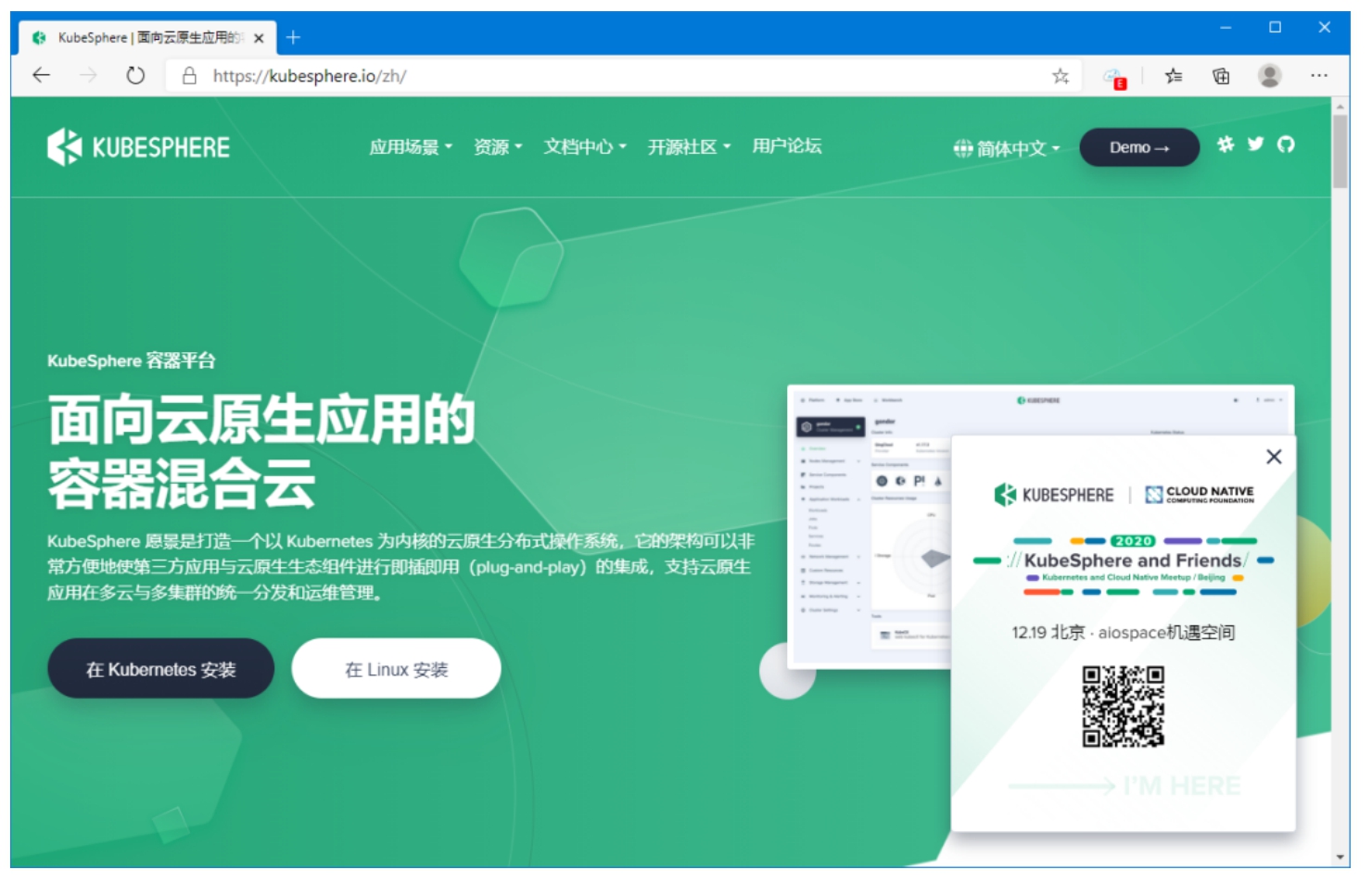KubeSphere目前最新的版本为3.0,其官方网站为:https://kubesphere.io/。