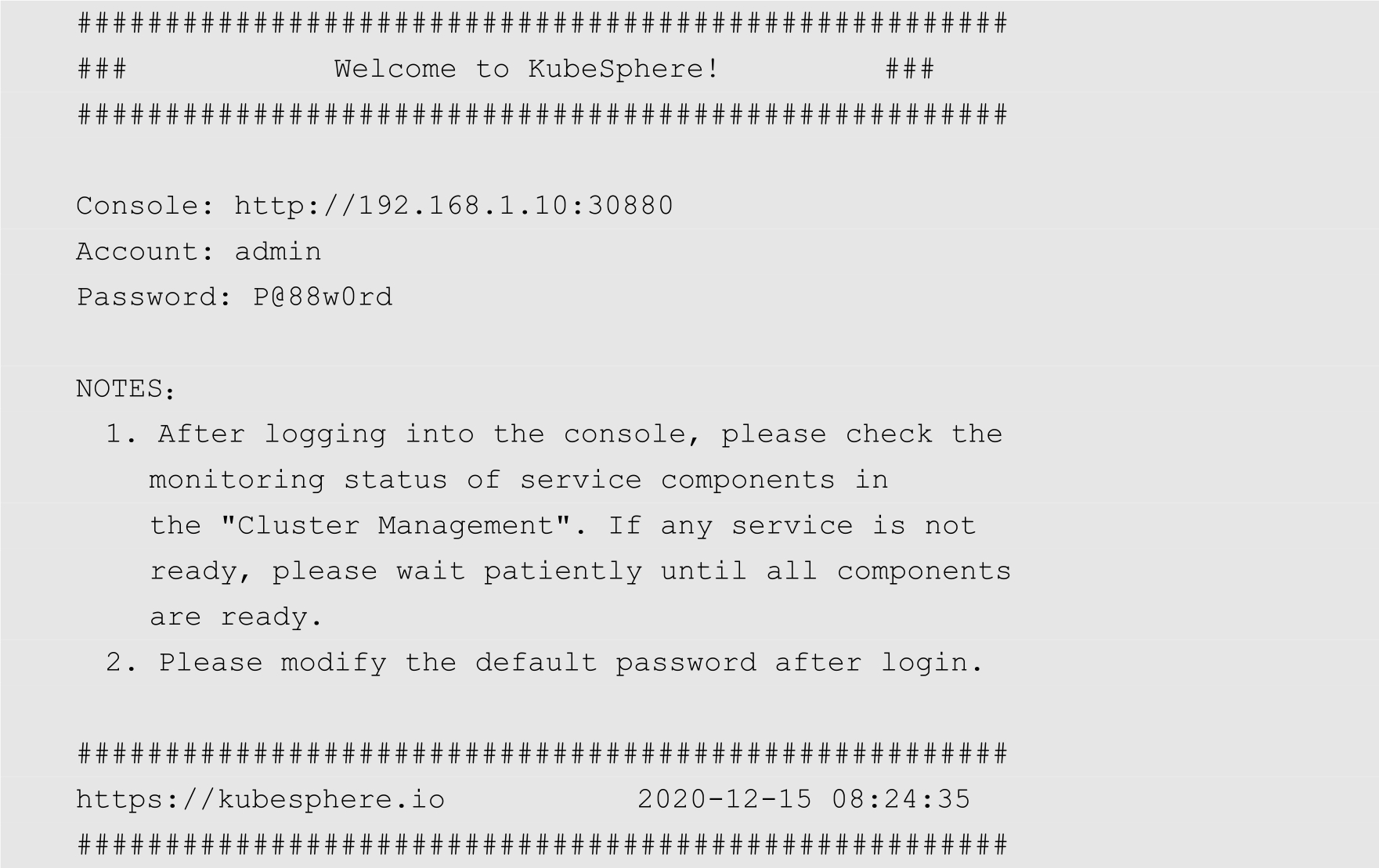 以上信息的输出表示KubeSphere已经安装成功,并且给出了控制台的地址、账号和默认的密码。用户可以通过以上信息登录控制台。