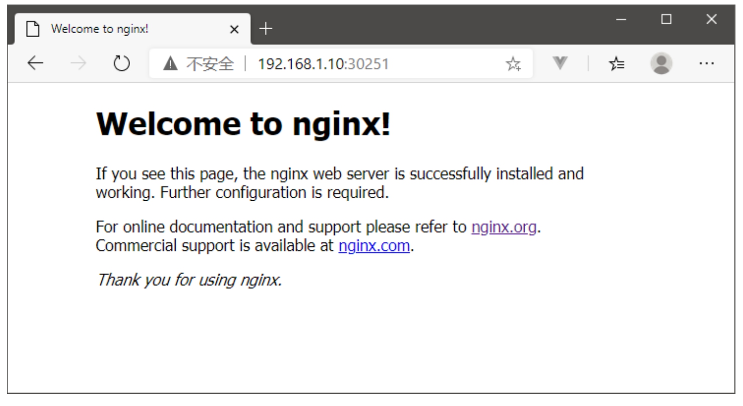 从图12-22可以看到,Kubeletes为当前的服务自动分配了一个端口30251。用户可以通过节点的IP地址和端口30251来访问Nginx了,如图12-23所示。
